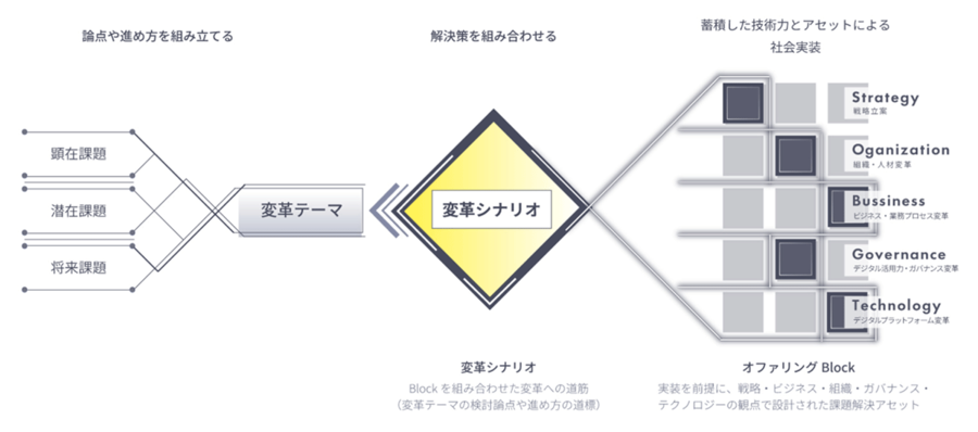 NSSOLが培ってきた実践知をもとにした「変革シナリオ」により、検討すべき論点や進め方を明確にし、さらに業界やテーマごとにアセット化されたオファリングBlock(※2)(課題解決アセット群)を組み合わせることで、構想にとどまらず、事業や現場で実際に機能する変革の実装へとつなげます。
