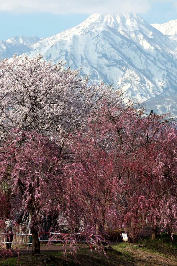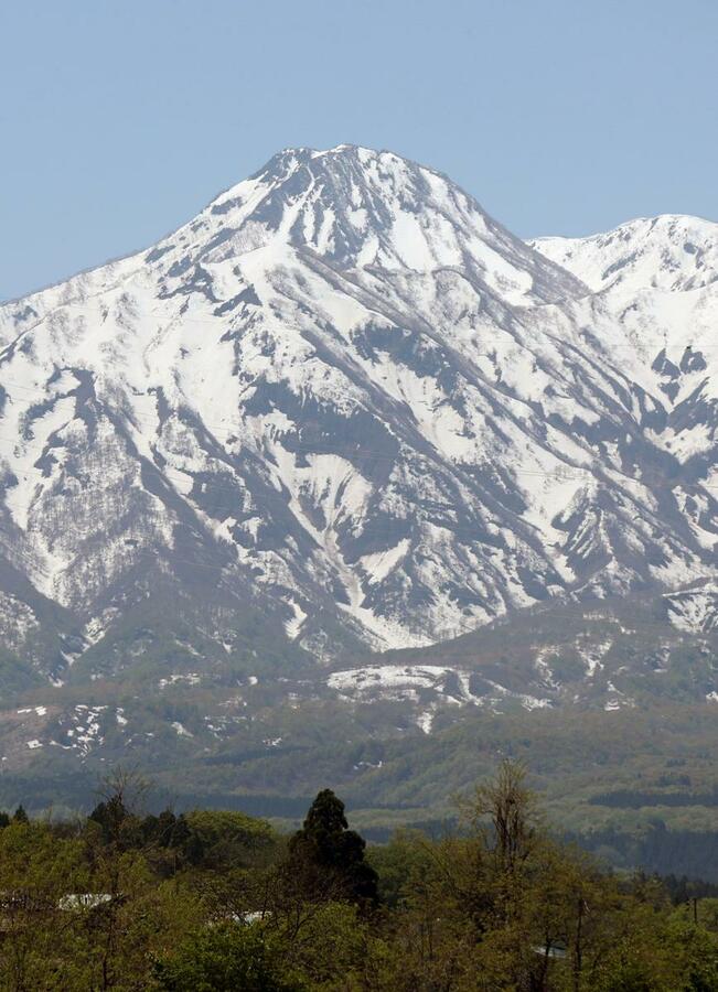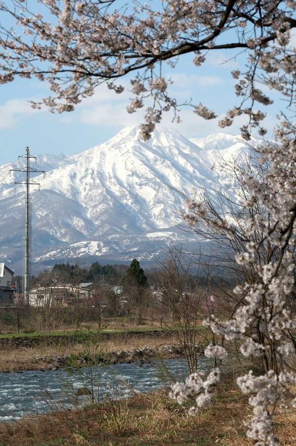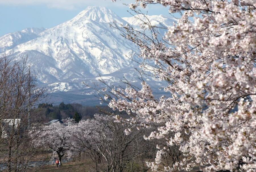 上越地域に春を告げる妙高山(2454メートル)の雪形「跳ね馬」が姿を現した。晴天となった8日、妙高市内では見頃を迎えた桜と共演する景色が広がった。