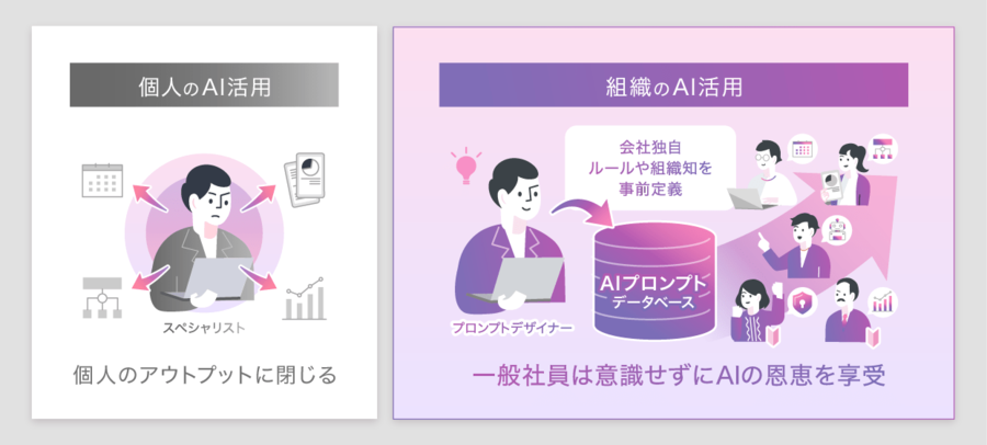 PAオプションは、プロンプトをデータベースとして一元管理し、プロンプトデザイナーがAIとの対話を通じてプロンプトを継続的に改善できる仕組みを提供します。 プロンプトデザイナーが業務に適した高品質なプロンプトを整備・管理することで、一般ユーザーが品質にばらつきのあるプロンプトを使用することなく、組織全体で統一された高精度なAI活用を実現できます。 さらに、AIを利用する業務やその範囲を明確に管理でき、安心・安全でガバナンスの効いた運用基盤を構築します。 これにより、属人化やスキル差による課題を解消し、ユーザーはAIを意識することなく安定した成果を得られるようになります。