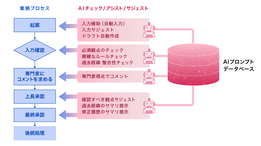 SmartDB(R)には多くの企業の業務プロセスが定義・実行されています。 PAオプションは、この「動いている業務そのもの」に直接AIを組み込むことで、AIが業務プロセスの流れの中で判断やチェックをおこない、意思決定と一体化します。 チェック、アシスト、サジェストといったAIが得意な処理が業務フローの各ステップに自然に溶け込み、組織全体の意思決定の精度とスピードが向上します。