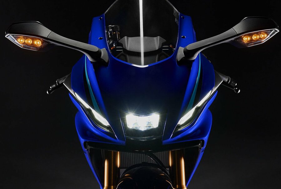 YZF-Rシリーズの伝統であり、ハイスピード・スタイリングの象徴でもある「M字ダクト」の意匠を継承しつつ、ダクト状になっていたヘッドランプまわりの造形は、表面をレンズで平滑化。これによりCd・A値*の低減やフロントタイヤの揚力抑制など、空力性能をさらに向上させました。ヘッドランプには優れた照射性とコンパクトさを両立した小型レンズモジュールを採用しています。