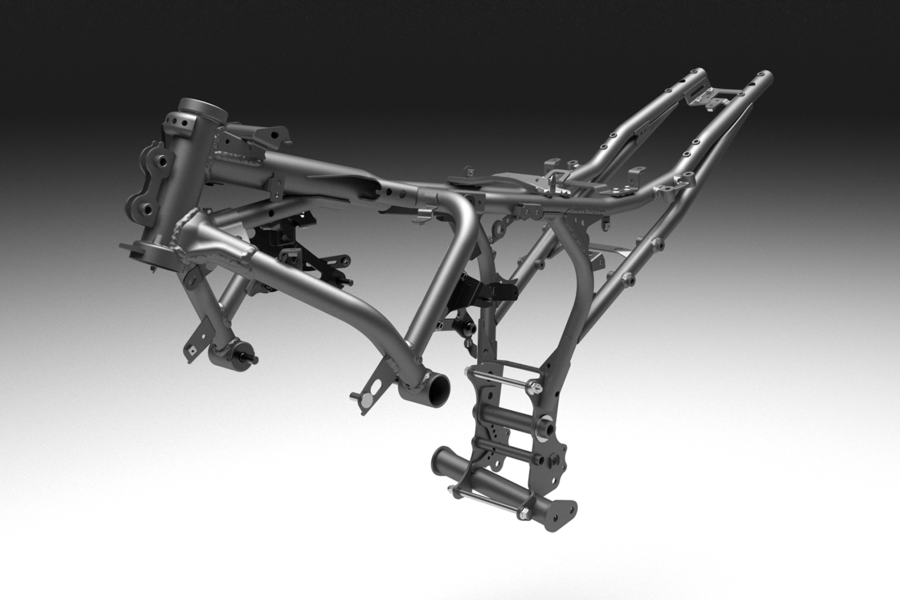 バックボーン型高張力鋼管フレームは、パイプワーク、径、肉厚、板金などを最適化。これにより従来モデル同等の重量を維持しながら、ねじれ・縦・横の各剛性を向上させ、優れたスタビリティに貢献させています。左右非対称形状のリアアームは、上面を削ぐようなカットを施すなどデザインを一新。あわせてリアサスペンション後端を支持するリンクも見直し、ブラケットの板厚を変更、優れた安定性の実現と接地感の向上を図りました。