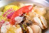 貝出汁ジュレと出汁氷で冷やした海鮮と野菜を、まずはそのまま“冷製”でお楽しみいただき、その後「明太とろろの冷製しゃぶ」として海老や帆立を明太とろろにくぐらせてお召し上がりいただく冷しゃぶです。さっぱりと濃厚が共存する新しい“しゃぶ体験”をお楽しみください。