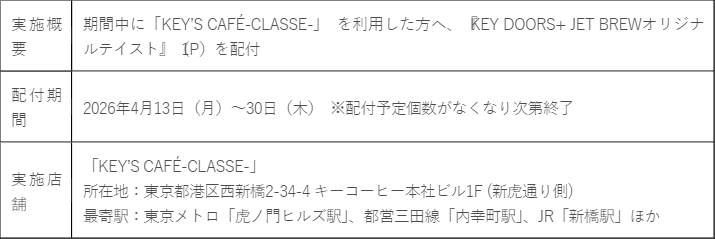 キーコーヒー株式会社(本社:東京都港区、社長:柴田 裕)は、4月13日の「喫茶店の日」に合わせ、「KEY’S CAFÉ-CLASSE-」(東京都港区)にて、同店をご利用の方に対し家庭用の簡易抽出型コーヒー『KEY DOORS+ JET BREWオリジナルテイスト』(1P)を配付します。