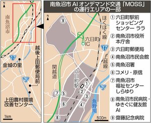 南魚沼市は、人工知能(AI)を活用した予約制乗り合いサービス(オンデマンド交通)の運行を、上田地区で始めた。愛称は「MOSS(モス)」で、乗降地点を上田地区と六日町市街地の87カ所に設定。予約のあった各地で利用者を順次乗せて目的地まで送り、買い物や通院など、日常生活の移動手段を確保する。市は上田地区を皮切りに、市内全域にオンデマンド交通を拡大していく考えだ。