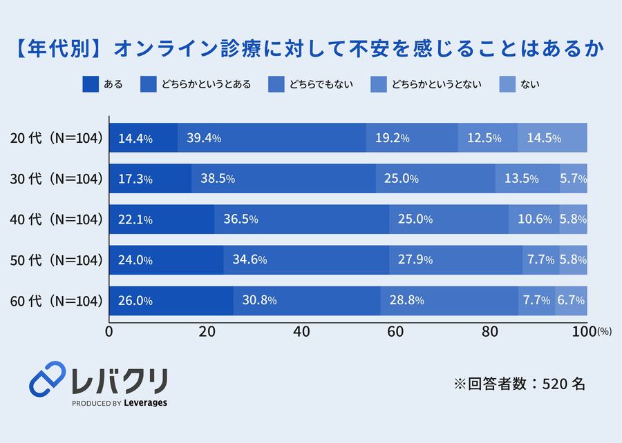 オンライン診療に対して不安に感じることはあるかという質問に対し、「ある(20.8%)」「どちらかというとある(36.0%)」が合わせて約6割にのぼりました。不安に感じる人の割合は50代が約58.6%と全年代で最も高くなりました。一方で、20代では「どちらかというとない(12.5%)」「ない(14.5%)」と回答した方が約4人に1人(27.0%)にのぼり、若年層ほどオンライン診療を受け入れやすい傾向が見られます。