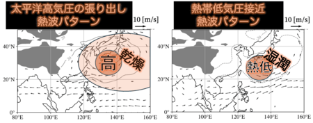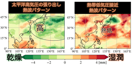 一般的にもよく知られているように、日本の熱波は、夏季の太平洋高気圧の西への張り出しにより発生する傾向があります。高温−乾燥フィードバック効果が弱いため、熱波は長続きしせず、太平洋高気圧による熱波が、日本の熱波の大部分であると考えられてきました。