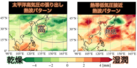 図2:(左)太平洋高気圧張り出し熱波パターン時と(右)熱帯低気圧接近熱波パターン時の上空の水蒸気積算量のパターン(白ドットなしの格子点: 統計的に有意)。値は、水蒸気積算量の平均からの偏差で、正の値は湿潤、負の値は乾燥を示す。左(右)は、高気圧性(低気圧性)で乾燥(湿潤)ある。熱帯低気圧によって、多量の水蒸気が輸送され、高温かつ高湿度の状況である。