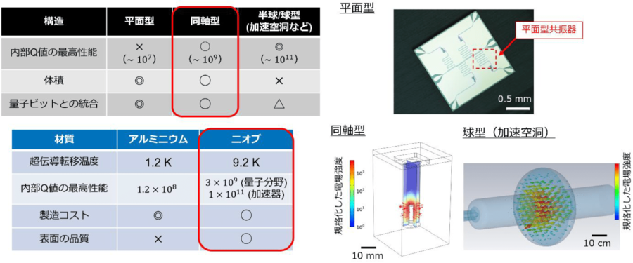 図1 共振器の構造と素材の比較表:(上) 超伝導量子デバイスで用いられる共振器の各構造の比較。今回採用した同軸型の構造は、共振器自体の性能と量子ビットとの結合性のバランスが取れた構造となります。(下)超伝導量子デバイスで用いられる素材の比較。コストや取り扱いの面からアルミニウムがよく使われるが、本研究では加速器分野で蓄積した処理手法を活用できるニオブを採用しました。(右)各構造の共振器のイメージ図。三次元構造の共振器には電場強度のカラープロットと電場の向きを表す矢印を示しています。