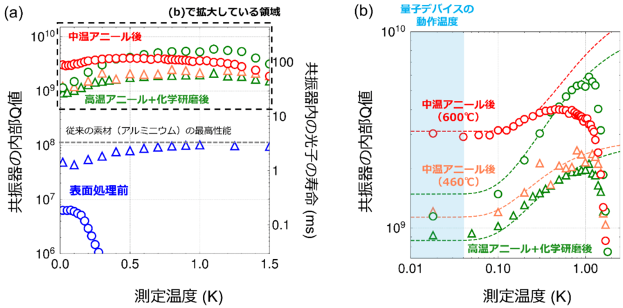 図2 表面処理による性能改善の様子:(a) 各処理の前後における空洞共振器の内部Q値と測定温度の関係。加速空洞の手法に準拠する下処理を実施することで、処理前と比べて内部Q値が大きく改善して約10億に達し、中温アニールによってさらに改善することが分かります。 (b) 加速空洞の手法に準拠する下処理後および中温アニール後の結果を抜き取ったもの。超伝導量子デバイスが動作する20ミリケルビンの極低温では、600℃アニール条件が最も高い内部Q値(約30億)を達成しています。破線は二準位欠陥による損失モデルによるフィッティング曲線を示しています。
