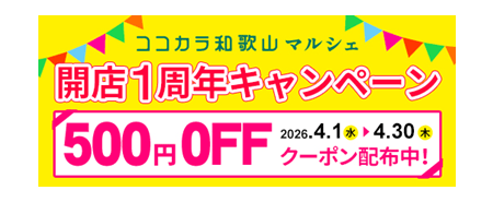 なお、「ココ・カラ。和歌山マルシェ」では、開業1周年キャンペーンを開催中で、4月30日までの期間中、先着2,000名様に「ココ・カラ。和歌山マルシェ」で使用できる500円の割引クーポンをプレゼントしております。