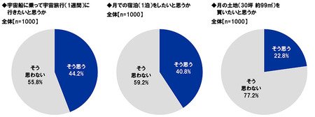 宇宙船に乗って宇宙旅行(1週間)に行きたいと思う人の割合(「そう思う」の割合)は44.2%、月での宿泊(1泊)をしたいと思う人の割合は40.8%、月の土地(30坪 約99㎡)を買いたいと思う人の割合は22.8%となりました。