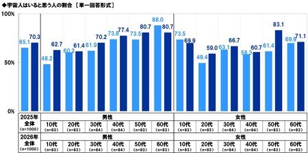 「宇宙人はいると思う」70%、昨年調査から5ポイント上昇