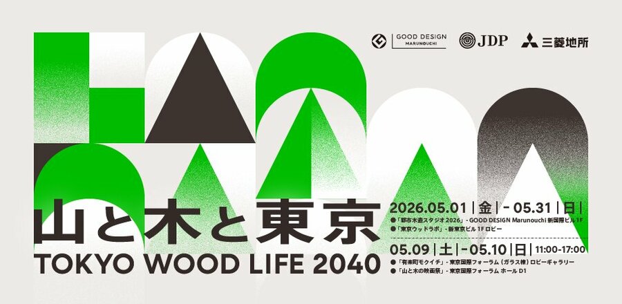 公益財団法人日本デザイン振興会(所在地:東京都港区、以下:JDP)は、三菱地所株式会社(所在地:東京都千代田区)の特別協賛により、3回目となる企画展「TOKYO WOOD LIFE 2040 山と木と東京」を2026年5月1日(金) より5月31日(日)まで開催します。 本年も日本の山林と都市の関係に焦点をあて、建築とデザインの企画展、映画祭、マルシェ、フォーラム、エクスカーション、スタンプラリーなど多数のイベントを実施し、建築やものづくり、まちづくりやコミュニティデザインなど多岐にわたる領域から都市の生活を2040年までに「WOOD LIFE」に変える方策と最新の実践を発信します。