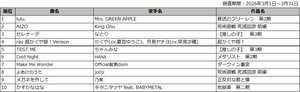 日本を代表するJ-POPシーンのビッグネームたちがアニメ主題歌を主戦場に激しいバトルを繰り広げているような、すさまじく豪華なランキングである。1位は名実ともに現在のJ-POPシーンを牽引するMrs. GREEN APPLEが担当した『葬送のフリーレン 第2期』オープニングテーマ「lulu.」、そして2位は『呪術廻戦』との濃密なコラボレーションを繰り広げてきたKing Gnu「AIZO」。Mrs. GREEN APPLEはもはや【国民的人気×覇権アニメの続編主題歌】という“鬼に金棒”状態のため当然の結果と言えるが、「AIZO」はKing Gnuらしからぬアニソン的な疾走感とサビのパワフルなポップネスがカラオケでウケている要因ではないだろうか。
