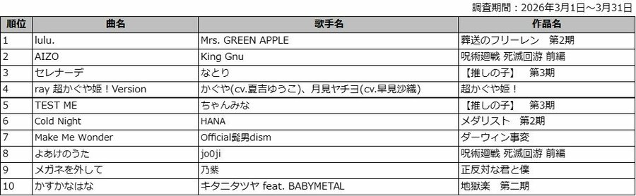 ■DAM 2026年冬アニメ主題歌 カラオケランキング TOP50