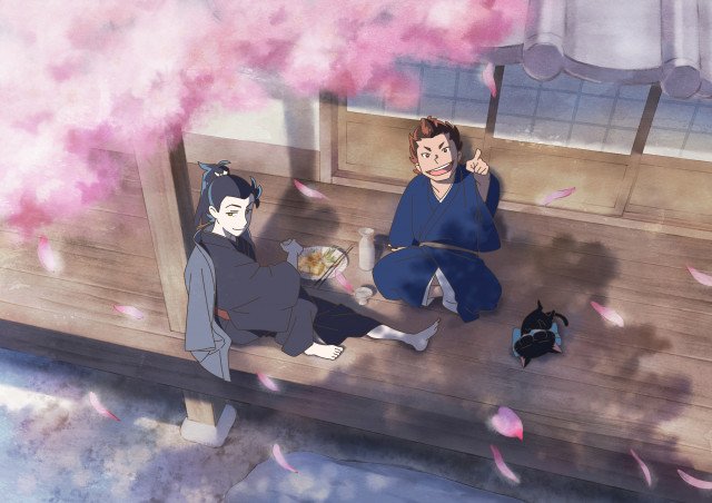 春のイラストに描かれるのは壬生浪士組副長の土方歳三、壬生浪士組局長の近藤勇。土方と近藤が屯所の縁側に腰掛け花見をしている様子と近藤の隣で眠るクロスケが描かれている。