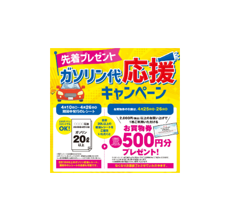 ・原油高、物価高対策 として、合計20L以上のガソリン給油レシートをお持ちいただくと、2,000円(税込)以上のお買い上げで1枚ご利用いただけるお買物券500円分を先着で進呈します。