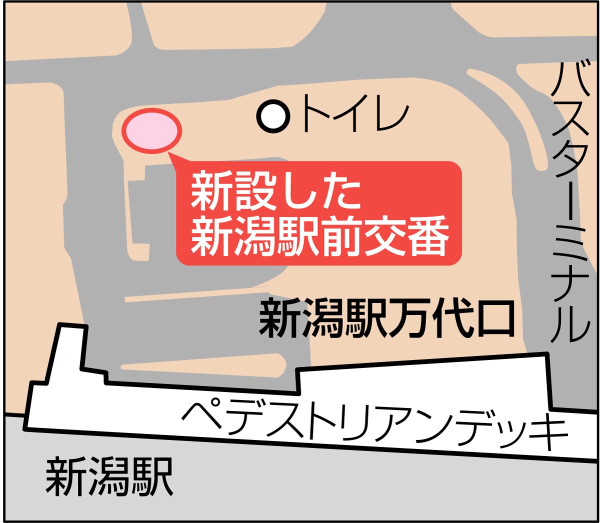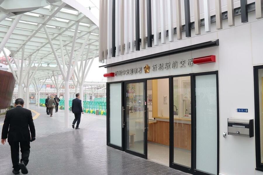 新潟市中央区のJR新潟駅前万代広場に「新潟駅前交番」(花園1)が新設され10日、開所式が行われた。駅周辺の再開発によるにぎわいが増す中、県都の玄関口の安全確保へ決意を新たにした。