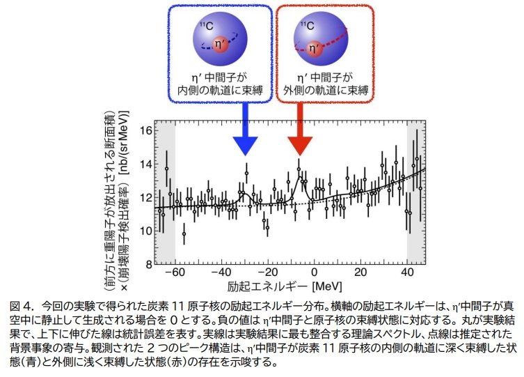 ・中間子の一種である η′(イータプライム)中間子と炭素原子核が、強い相互作用のみで束縛した全く新たな原子核の量子状態(η′中間子原子核)の兆候を、世界で初めて観測。