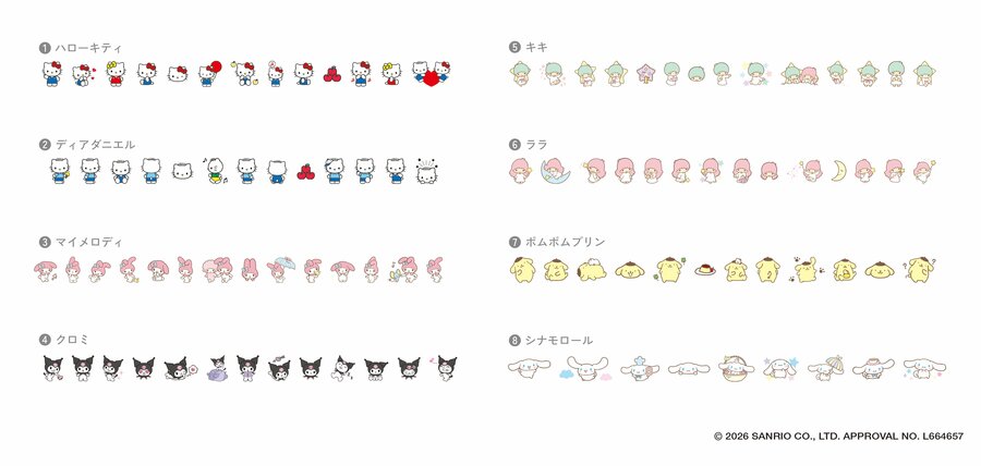 テープ幅は、太幅10 mmタイプ。全8種類(2柄セット×4種)の限定デザインは、「ハローキティ&ディアダニエル」「マイメロディ&クロミ」「リトルツインスターズ」「ポムポムプリン&シナモロール」をラインアップしています。
