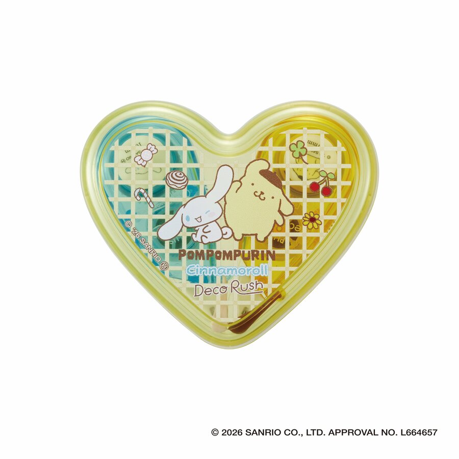 「デコラッシュ」の形状をいかし、ぴったり2個収納できるハート型のケースに、ハローキティやマイメロディ、シナモロールなどを、ペアごとに描いた限定デザインです。