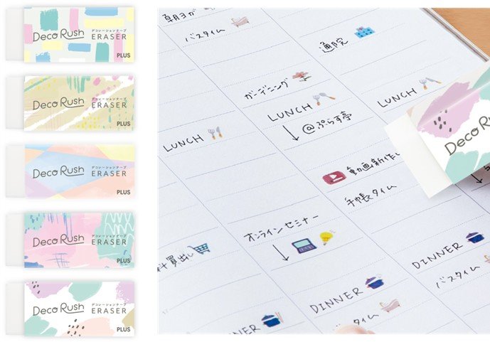 デコレーションを消すのに適した素材の「デコラッシュ専用消しゴム」(別売)があれば、予定変更や引き間違いを修正したい時も安心。「デコラッシュ」と並べても映えるかわいい5柄のケースデザインが揃っています。