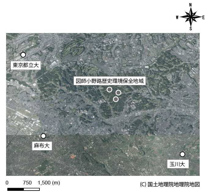 図1.ARUを設置した地点。各大学の周辺は市街地に囲まれている一方、図師小野路歴史環境保全地域は森林および農地に囲まれている。前者のARU周辺は街灯や建物からの光により夜間でも一定の明るさがある一方で、後者のARU設置地点の周辺は街灯もなく、夜間は非常に暗くなる。