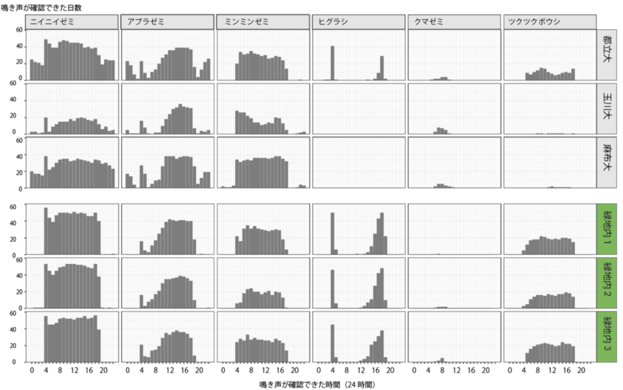 図2.調査期間を通して観測されたセミの種類および鳴いていた時間帯(24時間)。種ごとでおおむね鳴く時間に傾向があることが読み取れる。なお、ヒグラシの鳴き声は玉川大、麻布大では記録されなかった。各大学キャンパス内では、アブラゼミ、ニイニイゼミが0時~4時、20時~23時という早朝、深夜でも頻繁に鳴いていることが読み取れる。