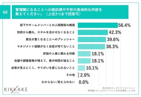 Q1で「非常に抵抗感や不安があった」「やや抵抗感や不安があった」と回答した方に、「Q2.管理職になることへの抵抗感や不安の具体的な内容を教えてください。(上位3つまで回答可)」(n=149)と質問したところ、「部下やチームメンバーとの人間関係の構築」が56.4%、「技術から離れ、スキルを活かせなくなること」が42.3%、「責任が重くなることへのプレッシャー」が39.6%という回答となりました。