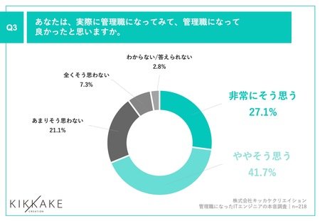 「Q3.あなたは、実際に管理職になってみて、管理職になって良かったと思いますか。」(n=218)と質問したところ、「非常にそう思う」が27.1%、「ややそう思う」が41.7%という回答となりました。