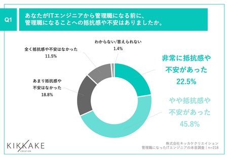 「Q1.あなたがITエンジニアから管理職になる前に、管理職になることへの抵抗感や不安はありましたか。」(n=218)と質問したところ、「非常に抵抗感や不安があった」が22.5%、「やや抵抗感や不安があった」が45.8%という回答となりました。