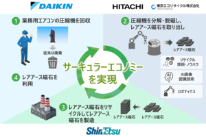 ダイキンが、同社製の業務用エアコンの圧縮機を回収し、東京エコリサイクルが分解・脱磁、レアアース磁石取り出しを担います。ダイキンから提供される技術情報を基に、東京エコリサイクルは日立とともに家庭用圧縮機のリサイクルで長年培った技術・ノウハウに、AI画像認識技術とロボットを連動させ、型式ごとに異なる分解プロセスの効率化を図るほか、直接的にCO2を発生させない共振減衰脱磁技術を用いて環境負荷を低減します。そして、取り出したレアアース磁石を再生素材として、信越化学が新たにレアアース磁石を製造します。