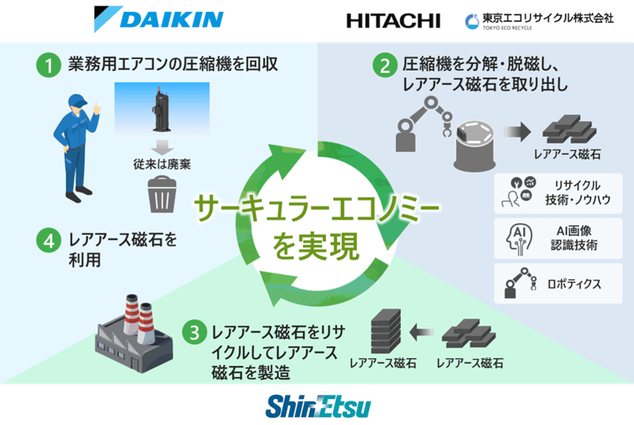 空調事業を展開するダイキン工業株式会社(以下、ダイキン)、レアアース磁石の製造・リサイクルを手掛ける信越化学工業株式会社(以下、信越化学)、資源の回収・リサイクルの技術を有する株式会社日立製作所(以下、日立)および東京エコリサイクル株式会社(以下、東京エコリサイクル)は、日本国内で修理やオーバーホールに伴い交換されるダイキンの業務用エアコンの圧縮機からレアアース磁石を回収し、再資源化する国内初の循環スキーム(以下、本スキーム)の構築に向けて、業界横断の協創(以下、本協創)を開始しました。分解・脱磁・レアアース磁石取り出しにAIの画像認識技術やロボットを活用して自動化し、効率化を図り、回収・分解・品質評価のプロセスを一貫したシステムでデータ管理することにより、トレーサビリティと最適化を実現します。