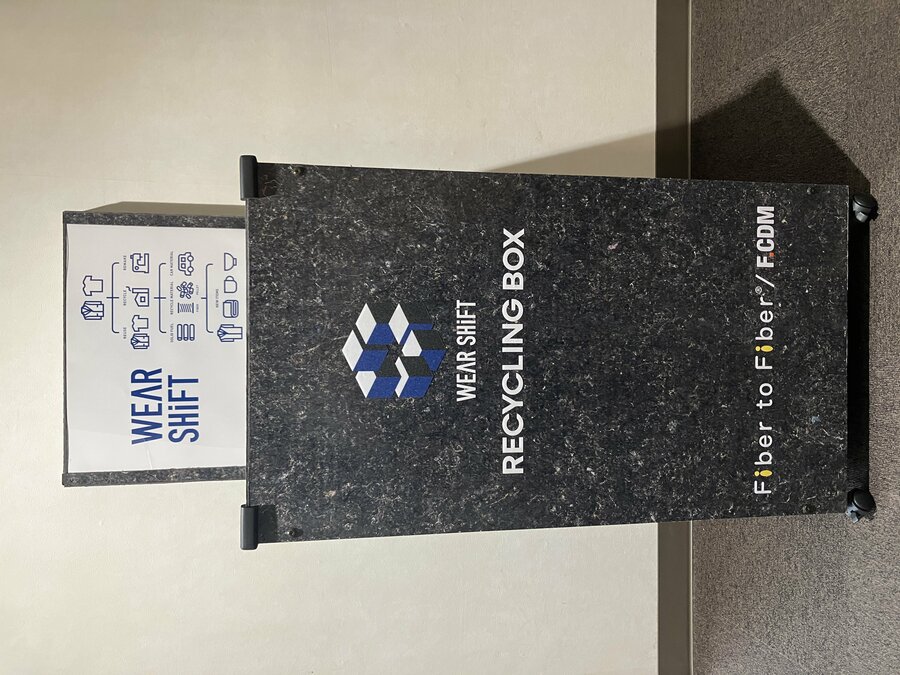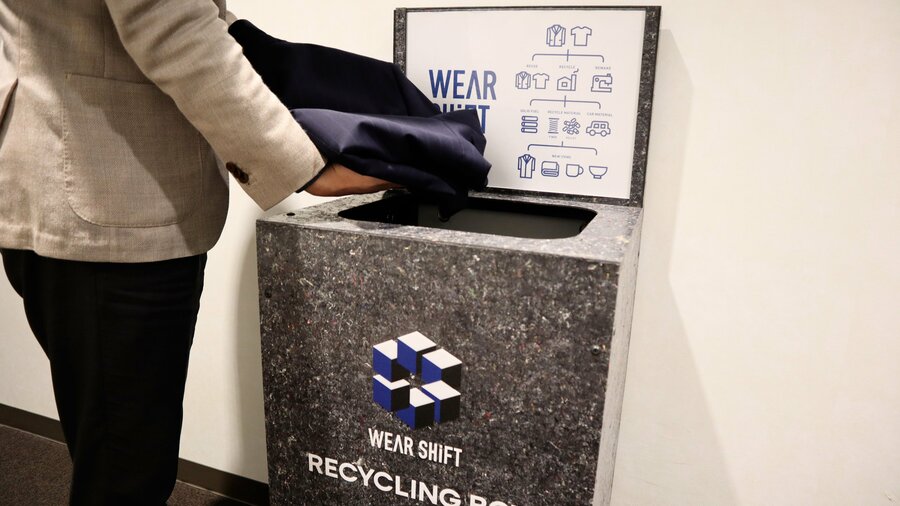 2023年10月から「終わらない服をつくろう。」という宣言のもと、全国の「洋服の青山」および 「スーツスクエア」の店内へ、不要になった衣類などを回収するリサイクリングボックスを設置。お客さまがより気軽にエコ活動に参加できる環境を整えました。2024年11月には、店頭で回収したスーツのウールを取り入れた循環型の「ウエアシフトスーツ」が誕生しています。