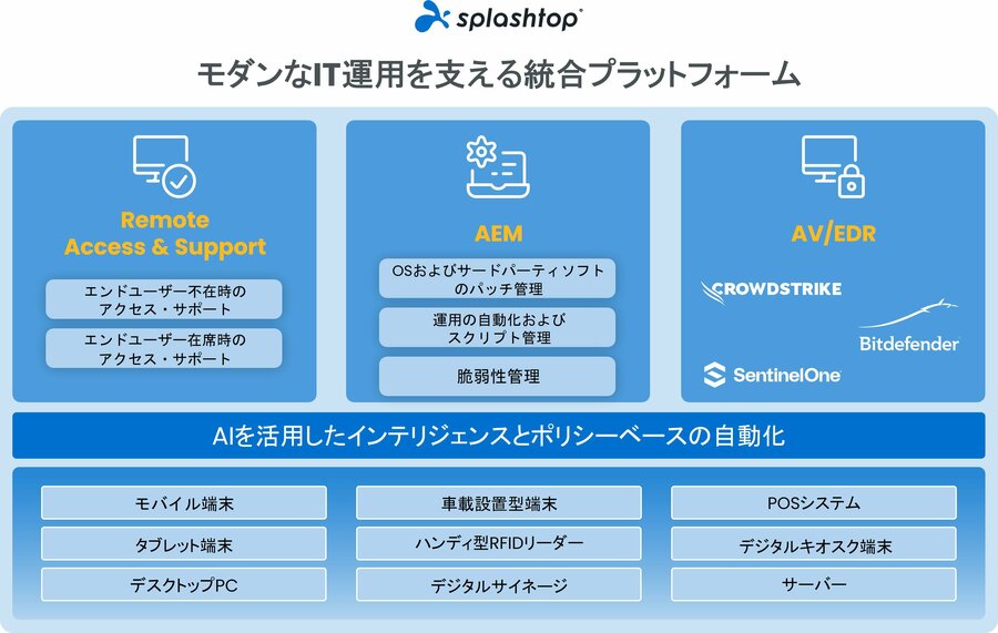 リモートアクセスソリューション「Splashtop」を提供するスプラッシュトップ株式会社(本社:東京都千代田区、代表取締役:水野良昭)は、次世代のIT運用を一元的に管理できる統合プラットフォームを、2026年5月より提供開始します。本発表は、Splashtopがリモートアクセスソリューションとしての実績に基づき、自律型エンドポイント管理(Autonomous Endpoint Management:AEM)を中核とした統合プラットフォームへと進化したことを示すものです。