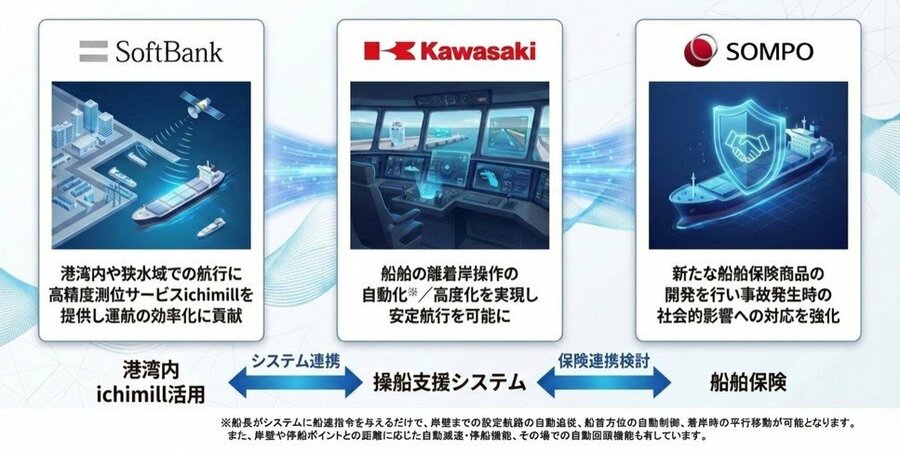 川崎重工業株式会社(本社:東京都港区、代表取締役社長:橋本康彦、以下「川崎重工」)、損害保険ジャパン株式会社(本社:東京都新宿区、代表取締役社長:石川耕治、以下「損保ジャパン」)、ソフトバンク株式会社(以下「ソフトバンク」)は、船舶の安全運航を支援するソリューションの提供に向けた基本合意を締結しました。今後、それぞれの強みを生かして、船舶における自動運航の社会実装を見据えた新たなソリューションの展開を目指します。