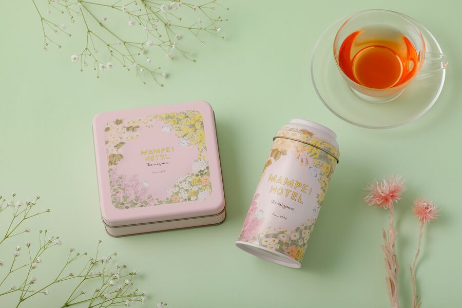 万平ホテルフラワーシリーズより、春の万平ホテルをイメージしたハーブティーが登場。今年3月に発売した「万平ホテルオリジナルハーブティー・朝焼け」に続く、季節のハーブティー第二弾です。また、缶の外装は、「フラワークッキー缶・春」と同じデザイン。春の動植物を描いたクッキーと、美しいピンク色のハーブティーで、穏やかな春のティータイムをご堪能いただけます。