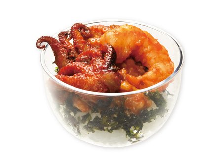 韓国・釜山発祥の辛い海鮮鍋料理で、最近流行りの“ナッコプセ”をアレンジした商品。イイダコ、牛もつ、エビ、ジャバン海苔を使用し、2種の粉唐辛子を使ったコチュジャンベースに、醤油や魚醤で塩味と味の深みを出しています。また、辛さを引き立てるため、氷糖蜜で甘みをプラス。にんにくやごま油が香り、コクのある辛さと甘さのバランスにこだわりました。