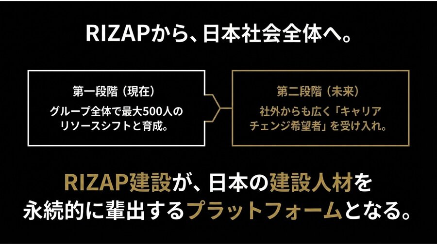 500人の専門人材創出: AI活用により捻出された最大500人の人的リソースへリスキリング機会を提供(技能・資格取得の全面支援)、RIZAP建設へリソースシフトを計画しています