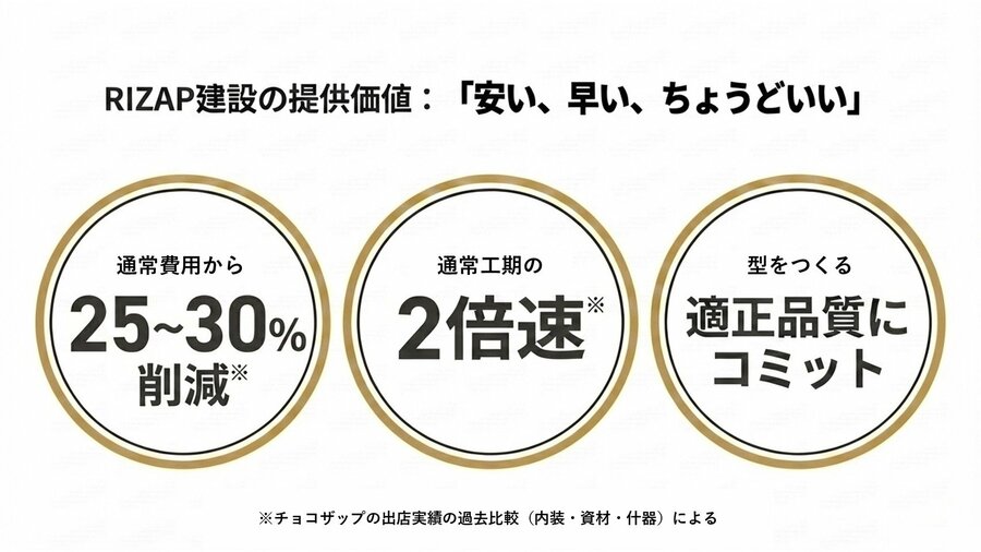 これにより、RIZAP建設は通常費用から25~30%削減※1、通常工期の2倍速※1、かつ適正品質にコミットした施工を提供します。