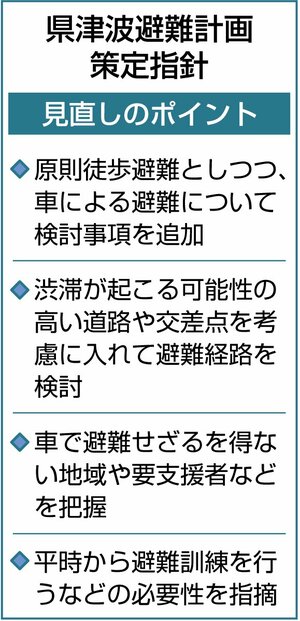 2024年の能登半島地震を受けて、新潟県は市町村が津波避難計画を策定する際の指針を見直した。見直しは18年以来8年ぶり。津波からの避難は「原則徒歩」としてきたが、車での避難も検討する。能登地震では多くの人が車で逃げて渋滞が発生するなど課題が明らかになったため、車で逃げるべき人や避難経路などの検討事項を明記し、実効性の向上につなげる狙いだ。
