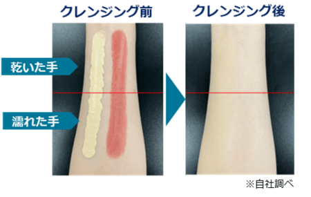 チューブタイプにしたことで、ジャータイプのバームクレンジングで生じる使いにくさ(水が入りやすい・スパチュラが必要・衛生面が気になる)を解消しました。自社の検証結果でも、乾いた手・濡れた手どちらもクレンジング機能を確認、W洗顔不要タイプで時間がない時でも、お風呂場でもシーンを選ばずお使いいただけます。
