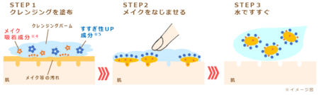 メイク吸着成分(※4)が汚れをマグネットのように引き付け包み込み、すすぎ性UP成分(※5)がそのまま素早く洗い流しメイク汚れの再付着を防止。汚れ残りを防ぎ、しっとりなのにスッキリとした洗いあがりを実現しました。