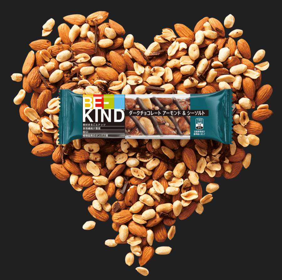 BE-KIND(R)(ビーカインド(TM))は「カラダよろこぶナッツバー(R)」として、「世界を少しでもやさしくする」というミッションを掲げています。「こころに嬉しい」と「カラダに嬉しい」を両立するナッツバーとして、食物繊維が豊富なナッツをできるだけ丸ごと使い、自然でほんのりとした甘さと素材本来の味わいを生かしています。植物由来のタンパク質を含む低GI設計で、おいしいかヘルシーかでもう迷わない、ヘルシーナッツバーです。