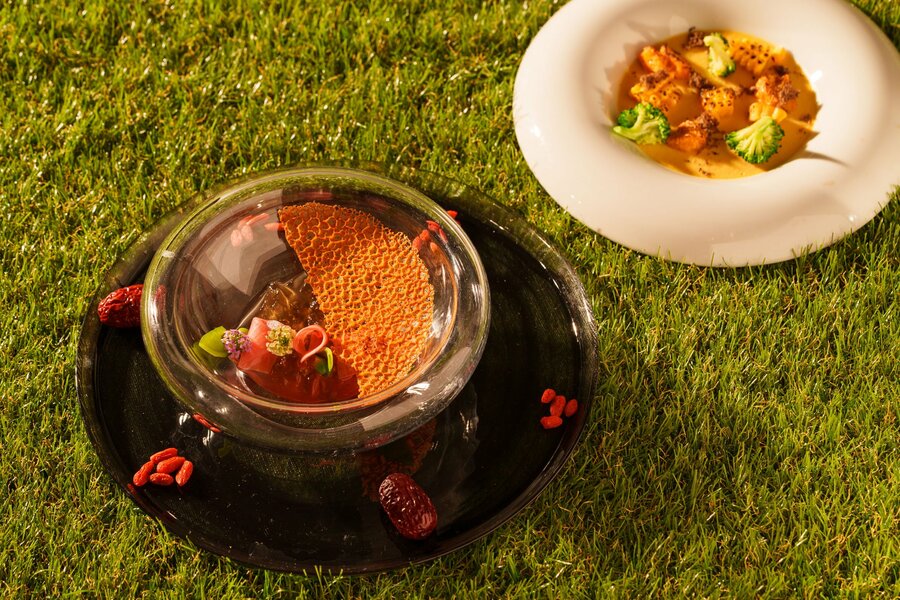 広々とした牧場でのびのびと育てられた新生漢方和牛は、軽やかな口どけと深い旨味が特徴で、コンソメスープとロティの二皿で異なる魅力を引き出します。冷前菜には同じ牧場の漢方豚のパテに、マンゴーや夏野菜をあわせて爽やかな香りを添えました。さらに、宮城県産穴子や蝦夷アワビ、三陸産ウニ、青森県産とうもろこし”嶽きみ”など、東北の海と大地が育んだ味覚を随所に散りばめました。帆立貝柱のエスプーマやキャビアを添えたカッペリーニ、桃とルビーチョコレートのデザートまで、この時期だけの味わいを存分にお召し上がりいただけます。
