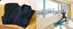 今回は、多忙な日常から少し距離を置いて心と身体を整える時間をお過ごしいただけるようプランをリニューアルし、TENTIALが開発したリカバリーウェア「BAKUNE Pajamas Dry」と、帝国ホテルオリジナルのアイマスクを新たにご用意します。また、客室はスイートルームをご用意し、スイートルーム内でフィットネスクラブの専門トレーナーによるパーソナルレッスンをご体験いただけます。