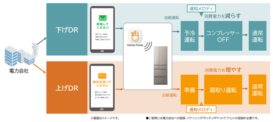 ※2 DR自動運転サービスのご利用には、中部電力ミライズが提供する「NACHARGE Link KADEN(ネイチャージリンク カデン)」へサービス申し込みの上、DR機能を搭載したパナソニック製冷蔵庫およびパナソニックのサービスアプリ「Kitchen Pocket」上での初期設定が必要です