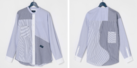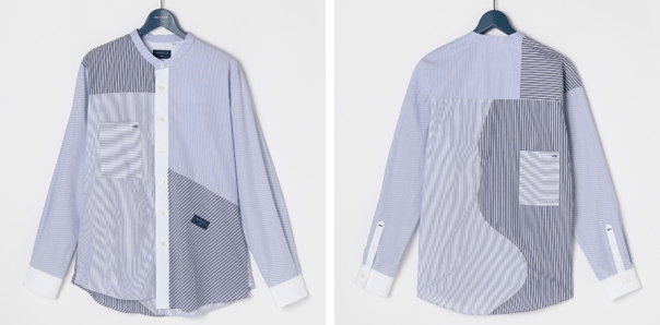複数の異なるストライプ生地を組み合わせたクレイジーパターンが最大の特長。正面は直線的な切り替えに加え、斜めのラインを取り入れることで、視覚的な動きを表現し、背面は大きな曲線の切り替えが施され、まるでアート作品のような構成です。全体をブルーとホワイトのトーンでまとめることで、複雑な切り替えがありながらも上品で清潔感のある印象を保っています。