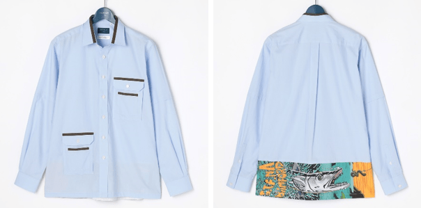 正面には大きめのフラップ付きパッチポケットをアシンメトリーに配し、背面の下部には魚をモチーフにしたダイナミックなイラストがプリントされたデザインが目を引く一着。襟の内側とポケットには茶色のパイピングが施され、ふとした瞬間に見えるこのラインが、全体のデザインに統一感を与えています。ビジネスウェアとストリートアートの感性が融合しています。